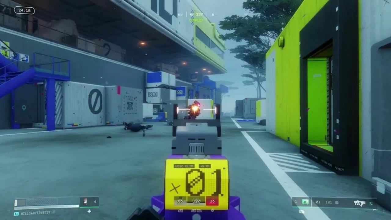 You might believe that between the UESC robot enemies and other players, the other players are the more dangerous threats. That's still technically true because robots are predictable and other players are not — but you should absolutely not underestimate the UESC enemies. Everything bearing the UESC brand — the robots, their commanders, the turrets — is very deadly.