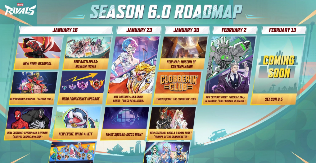 - January 16 (Launch): Deadpool debut, "Museum Ticket" Battle Pass, Whac-a-Jeff event, and new shop skins for Venom and Spider-Man.