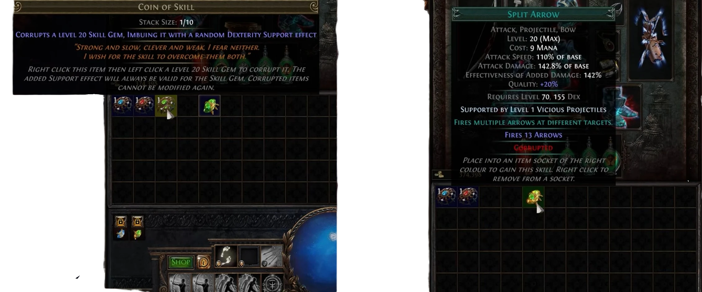 Slain enemies in Mirages will rarely drop some of the most powerful instruments of Maraketh Magic — Coins of Power, Skill, or Knowledge. Each of these can be used on a Level 20 Skill Gem, corrupting it and imbuing it with a Level 1 Support effect which will inherently support that Skill.