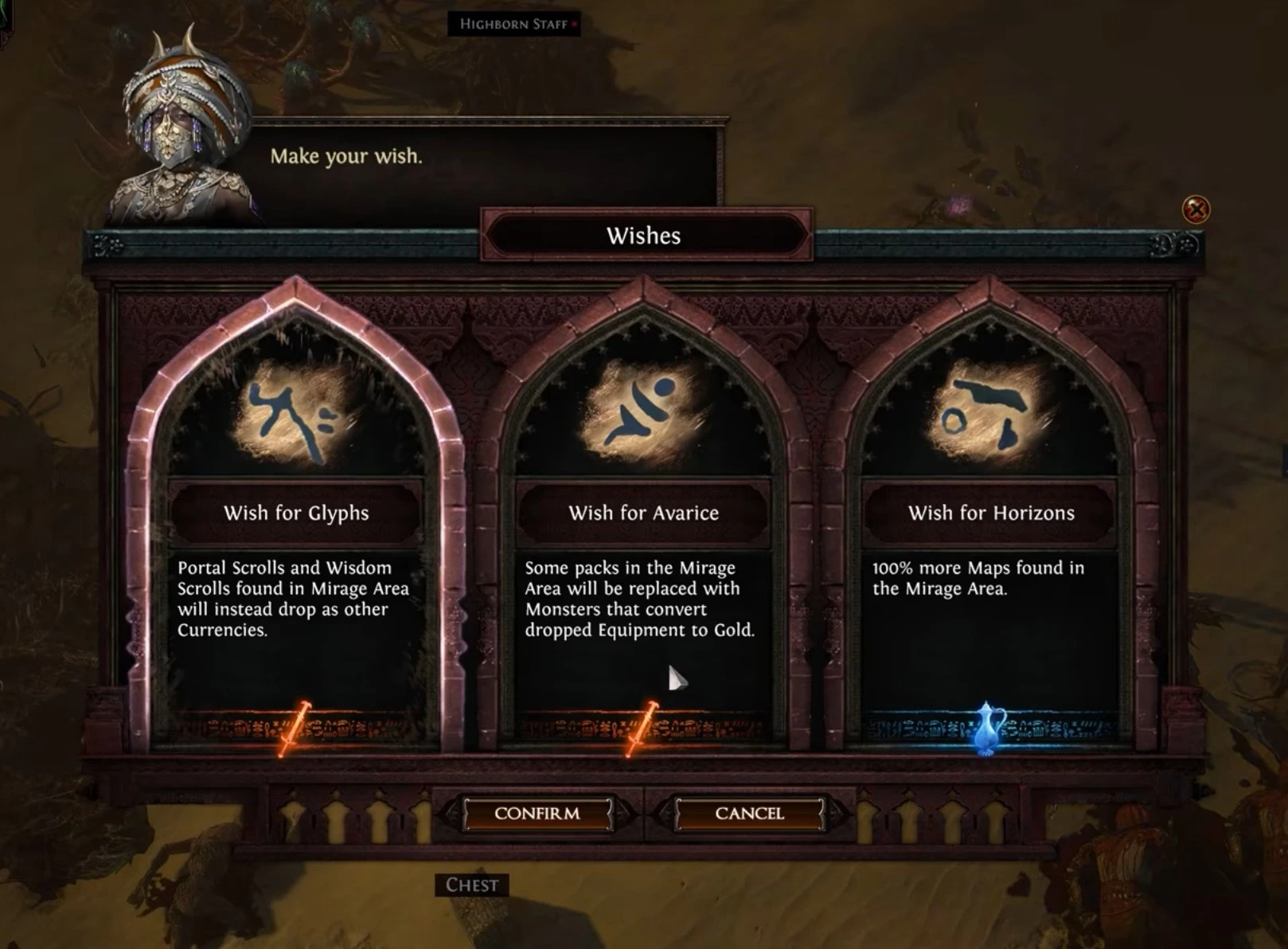 Before entering the Mirage, your ally Varashta offers you a choice of three Wishes. Each Wish is a powerful modifier that changes the rules, difficulty, and rewards of the Mirage you're about to enter. This makes every Mirage experience customizable — do you want a higher challenge for better loot, or a safe and steady clear? The choice is yours.