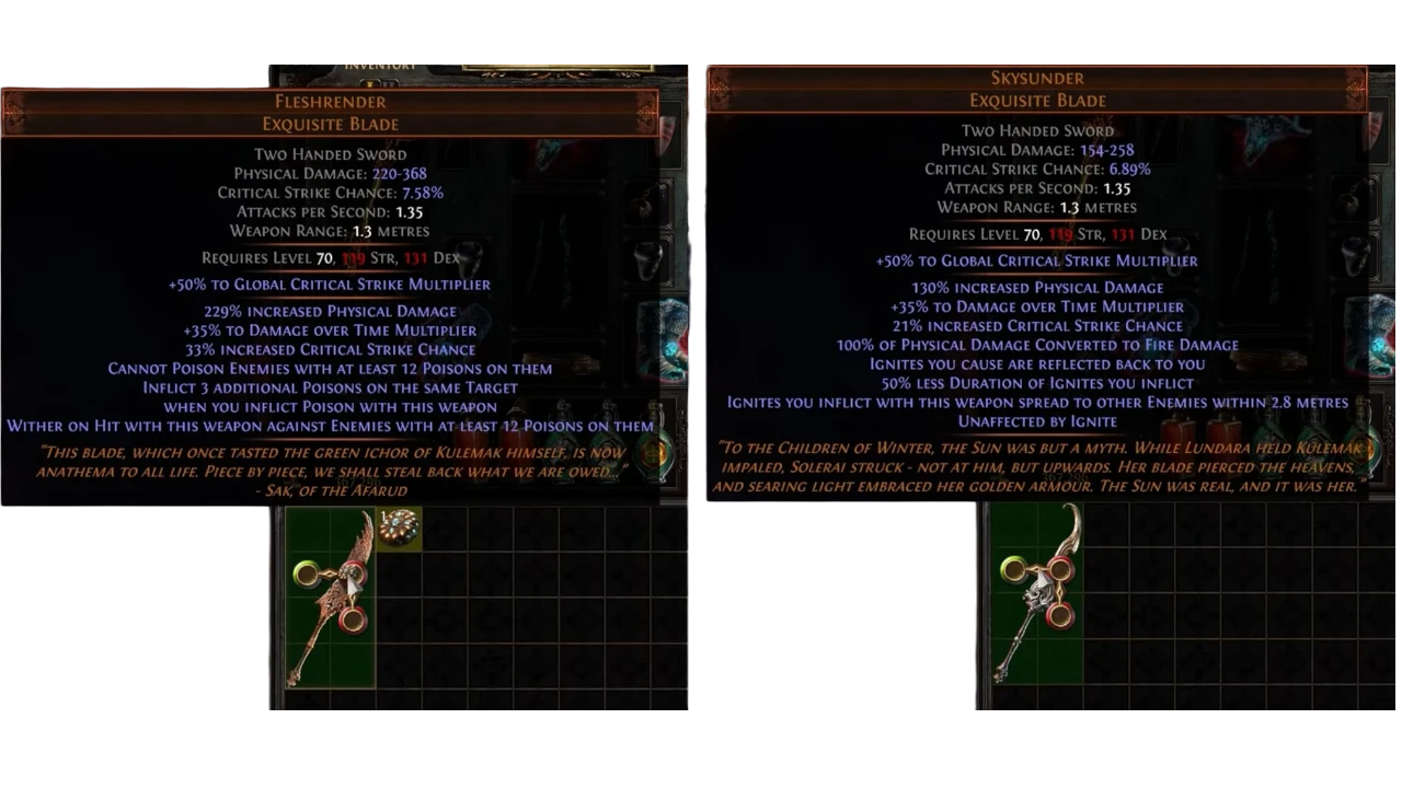The Mirage League introduces new Unique items that bring back an old feature — upgrading Uniques, similar to the old Fated Uniques from the now-removed Prophecy League. When slaying Afarud monsters in the Astral Realm, you have a chance to obtain a Coin of Restoration. For example, Fleshrender can be upgraded using a Coin of Restoration, transforming it into Skysunder.