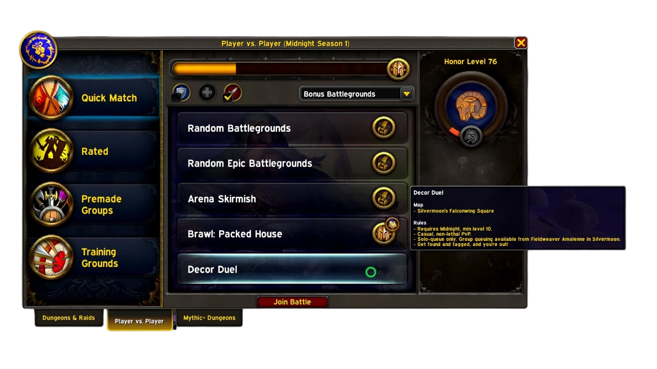 Open the Group Finder menu with the I key and switch to the PvP tab. Under Quick Matches you will see the Decorator's Duel mode listed alongside the standard PvP options.