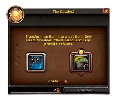 Additionally, you can use The Catalyst to transform items on slots that don't have tier options (Cloak, Wrist, Waist, Boots). These items won't convert into tier pieces but rather into items that share the appearance of said tier. In some cases it also swaps the secondary stats that item provides.