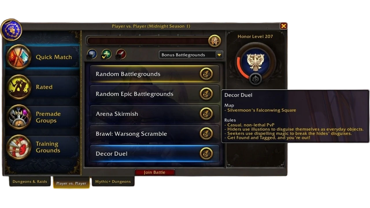 The most surprising addition in Patch 12.0.5 is Decor Duels, a 5v5 hide-and-seek PvP mode set inside Silvermoon City, built directly on top of Midnight's player housing system. One team of five disguises themselves as housing decor items — chairs, potted plants, bookshelves, barrels, statues — and must blend into the existing environment. The other team hunts them down and must tag disguised players before the timer runs out.