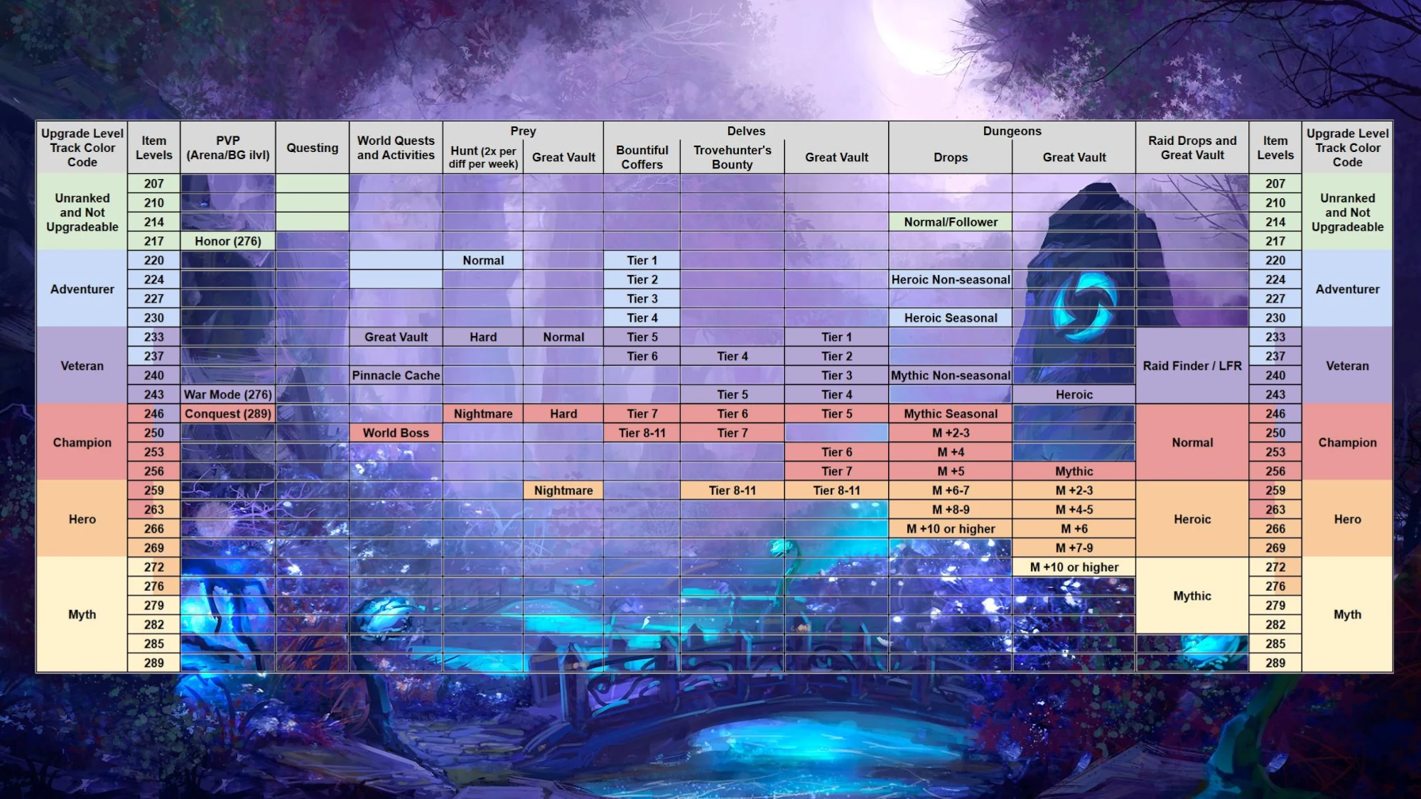 | Myth Crests | Hero & Myth gear | Mythic+ 7+, Heroic end bosses, Tier 11 Bountiful Delves | 100/week |